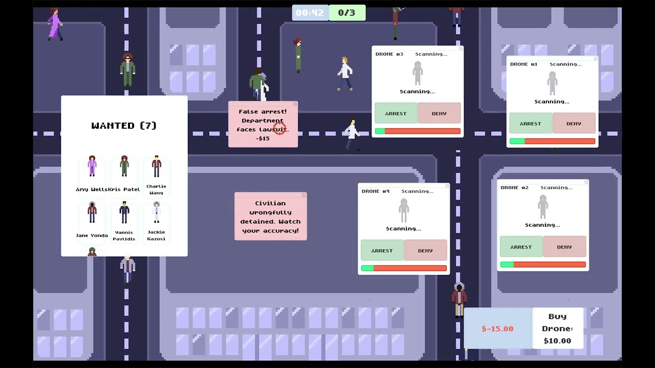 As a surveillance operator, players monitor urban areas through a moveable top-down camera, identifying suspects from a wanted list while managing increasingly unreliable automated drones.